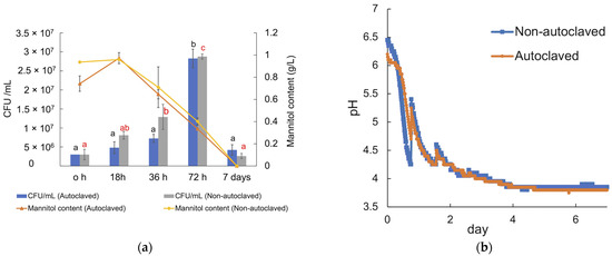 Carbohydrate quantification of the dried A. esculenta seaweed, which underwent a two-step acid hydrolysis process, revealed that it comprises approximately 29% carbohydrates, consisting of around 12% neutral sugars (of which 6% was mannitol) and approximately 17% uronic acids that are the primary constituents of alginate (Table S1). The analysis of carbohydrates in the soluble fraction of the seaweed slurries, including both autoclaved and non-autoclaved reactors, indicated that only mannitol was released into the liquid suspensions. The slight increase in the concentration of mannitol at the beginning is judged to be due to the solubilization of mannitol by the heat and pressure applied [30]. In both inoculated conditions, the CFU increased up to approximately 3 × 107 CFU/mL (p < 0.05) after 72 h of fermentation, but the CFUs decreased significantly after 7 days, after depletion of the mannitol that served as the carbohydrate source.