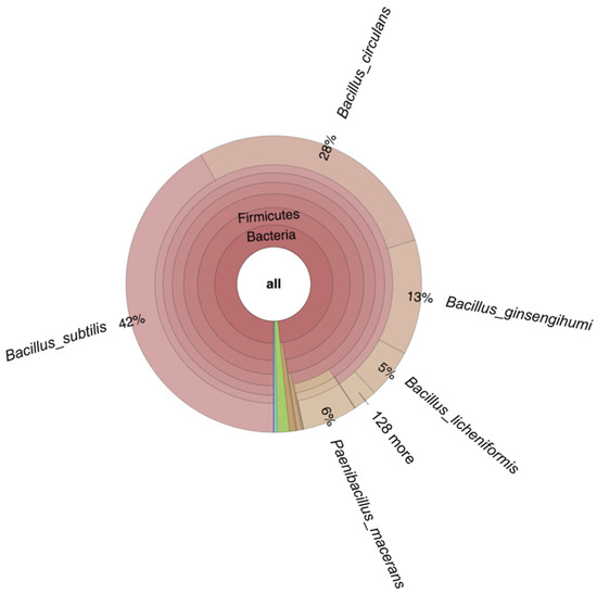 In the non-inoculated reactor with autoclaved seaweed slurry, run to monitor the growth of endogenous microbiota, only a slight drop in pH to pH 5.7 was observed while mannitol was consumed completely. In this case, the seaweed slurry became slimy and foamed, and an unpleasant smell was noticed after opening the reactor. Metagenome analysis of the corresponding seaweed sample revealed that the seaweed contained bacteria (relative abundance 96%), fungi (relative abundance 2.8%), and minor amounts of archaea, viruses, and Eukaryota (relative abundance 1.4%). A mixture of Gram-positive spore-forming bacteria strains (93.76% from the genus Bacillus and 6.23% from the genus Paenibacillus) was present in the seaweed slurry (Figure 9), which could not be eliminated by autoclaving, and incubation at 37 °C of autoclaved seaweed slurry resulted in their growth and, hence, spoilage of the seaweed. Similar spoilage was also observed for non-autoclaved seaweed slurry without LAB inoculation. However, metagenome analysis of the latter was unsuccessful due to insufficient amounts of DNA for sequencing.