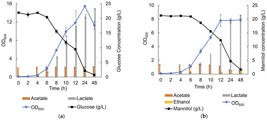 In MRS containing approximately 21.3 g/L mannitol, lactic acid production was observed from an early stage of the growth and continued throughout the cultivation, reaching a maximum of 21.38 ± 0.12 g/L. However, when the stationary phase was entered, acetate (From MRS) was consumed (2.25 ± 0.07 g/L acetate consumption), and ethanol production (1.6 ± 0.1 g/L) was observed (Figure 10b), which was not the case using glucose as the sole carbon source. A small peak corresponding to succinate was also observed after 8 h cultivation but was not quantifiable. In the presence of xylose, acetate was produced with a final concentration of 1.23 ± 0.04 g/L over 72 h of cultivation.