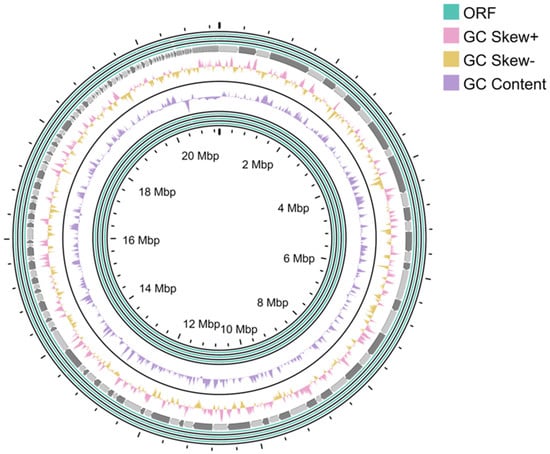 The assembled genome strain CP72-2 comprised 295 contigs, totaling 21,358,924 bp, and a high GC content of 64.90%. Furthermore, this assembly had an N50 value of 223,398 bp, an L50 value of 29 bp, and a maximum scaffold length of 748,751 bp. The program tRNAscan-SE identified 170 transfer RNAs (tRNAs) and 189 non-coding RNAs (ncRNAs) in the CP72-2 genome. The circular genomic map of Rhodotorula sp. CP72-2 is shown in Figure 1. Notably, the genome size of strain CP72-2 is consistent with other known red yeasts, including R. graminis WP1, R. glutinis ATCC 204091, R. toruloides NP11, and Rhodotorula sp. JG-1b has a genome size of approximatel 20–21 Mbp []. These results provide valuable insights into the genomic characteristics of red yeasts and contribute to our overall understanding of their biology.