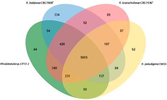Venn diagram showing the shared/unique protein in Rhodotorula sp. CP72-2 and comparison with those in R. kratochvilovae CBS 7436T, R. babjevae CBS 7808T, and R. paludigena CM33.