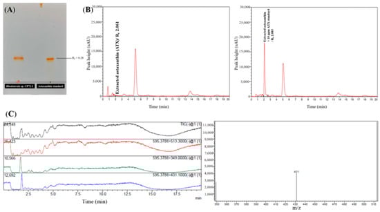 Thin Layer Chromatography (TLC) of an acetone extract of strain CP72-2 and astaxanthin standard (A); The determination HPLC chromatogram of extracted astaxanthin (non-spiked) and extracted astaxanthin + 10 ppm astaxanthin standard (spiked) of strain CP72-2 in DMSO (B); LC-MS chromatograms (MRM, negative scan mode) of extracted astaxanthin of strain CP72-2 in DMSO (C).