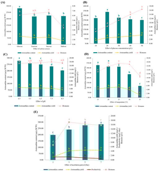 Effect of carbon sources (A), glucose concentration (B), pH (C), temperature (D), and incubation period (E) on the astaxanthin content (mg/g DCW), biomass (g/L), astaxanthin yield (mg/L), and productivity (mg/L/day) of strain CP72-2. All experiments were performed in triplicate, and the results were reported as the mean ± Standard Deviation (SD). Letters above the bars coded by different colors represent biomass, astaxanthin content, and astaxanthin concentration, respectively. According to Duncan’s test (p < 0.05), the levels not connected by the same letter are significantly different. (For interpretation of the references to color in this figure legend, the reader is referred to the web version of this article).