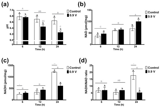 Effects of in vitro ruminal electrofermentation using application of electric potential (0.9 volts) for 6, 12, and 24 h on pH (a), NAD (b) and NADH concentration (c), and NADH/NAD ratio (d). Means values and SEM. The data were analyzed using a two-way ANOVA to determine whether there were significant differences in means of parameters between the electric potential treatments and the treatment times. Different letters indicate significant differences according to the post hoc analysis using Tukey’s HSD test at p < 0.05 (capital letters indicate the effects of the time factor and lowercase letters indicate the effects of treatment group factor, and *, ** indicates the significant differences for the factor interaction effects of treatment group vs. time).