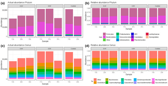 Bacterial composition abundances of EF-treated rumen fluid at 24 h of operating time are shown in Figure 4. An average abundance of 4517 reads for the control treatment was observed, and the application of 0.9 V electric potential resulted in a higher abundance of 4686 reads (Figure 4a). A total of 17 bacterial phyla were obtained across all samples, and the two most predominant were Firmicutes and Bacteroidetes, with average proportions of 52.38% and 40.59% for the three groups, respectively (Figure 4b). The phylum Proteobacteria also represented a considerable fraction (1.08%), followed by Verrucomicrobia (0.95%) and Actinobacteria (0.84%) across the three samples. The remainder of highly abundant phyla observed represent the 1.31% clustered as “Other” (Tables S3 and S4). No differences were found in the Firmicutes/Bacteroidetes ratio, which ranged from 1.19 to 1.35 among the groups, although the 0.9 V treatment presented the highest values.