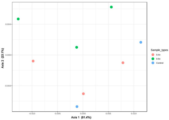 Principal coordinate analysis (PCoA) plots of the bacterial community compositions in the rumen fluid in electrofermentation systems, achieved using a Jensen–Shannon divergence. The percentages of variation explained by PC1 and PC2 are indicated on the axes.