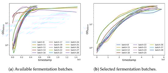 As mentioned in Section 2.2.1 (Fermentation Selection), we performed a preprocessing stage to select a subset of fermentations suitable to train, validate, and test the machine learning model. The selection criteria are based on the quality and consistency of the acquired data. Firstly, we defined the “canonical” fermentation settings, in which we removed the fermentations that have not been accomplished using the canonical settings. This category includes the preliminary fermentations used to establish the canonical settings, as well as some fermentations that use glycerol as a carbon source (see Figure 3). Secondly, we excluded fermentations that suffered from some failure during the process, as well as fermentations with no production of the recombinant protein. Lastly, we trimmed data points (mainly from the tail ends) from some of the batches (e.g., 25, 26, 28) for which we did not have periodic OD600nm readings.