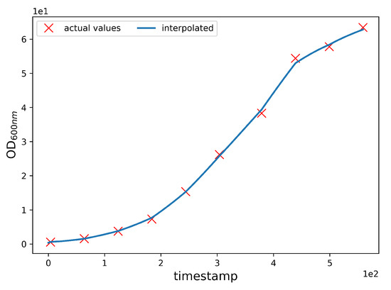 OD600nmInterpolation. The CPP data and the OD600nm data have a temporal inconsistency, because CPP values are acquired with a frequency of one per minute, whereas the OD600nm values are acquired with a frequency of one per hour. However, the machine learning algorithm requires that the sampling frequency is equal for both the CPP and OD600nm values. To overcome this issue, we interpolate OD600nm values by linearly mixing values obtained from separately fitted linear and polynomial interpolations. Specifically, the interpolated values are obtained with the following expression: