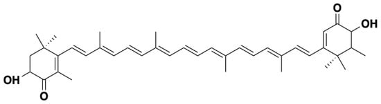 Astaxanthin is a fat-soluble xanthophyll carotenoid synthesized by certain bacteria, fungi, and algae and found in crustaceans and various aquatic animals []. Recently, astaxanthin has received considerable attention due to its extraordinary merits such as its superior antioxidant and anti-inflammatory activity. It has been reported that global natural astaxanthin production has steadily increased from 44 tons in 2013 to 68 tons in 2014, with an average rate of 11.23% per year []. Consequently, astaxanthin has become a highly demanded metabolite, and its global market size was estimated at USD 1943 million in 2022 []. The leading driving factor for the market growth of astaxanthin is its demand from various applications such as nutraceuticals, pharmaceuticals, cosmetics, aquaculture and animal feed, and the food industry. It possesses significantly superior antioxidant activity, even more than vitamin E and β-carotene []. Hence, astaxanthin is a well-documented nutraceutical for cardiovascular disease prevention [,], skin protection [,,], antidiabetic [,], anticancer [,], anti-obesity [,], anti-inflammatory [,], antiaging [,], natural food colorant [], and feed supplement in poultry and aquaculture [,,]. Structurally, astaxanthin is a 40-carbon tetraterpene consisting of two terminal β-rings joined by an unsaturated polyene chain (Figure 1). The presence of 11 conjugated double bonds determines the pinkish-orange color of astaxanthin and is responsible for its antioxidative potential [,,]. As a member of the xanthophyll subclass of carotenoids, astaxanthin possesses oxygen-containing hydroxyl and carbonyl groups attached to each ionone ring []. The presence of oxygen atoms on both terminals of the terpenoid chain confers a remarkable polarity of the molecule. Owing to this unique polar–nonpolar structure, astaxanthin can fit the hydrophobic polyene chain (lipophilic) inside the bilayer lipid in the cell plasma membrane, and its polar terminal ionone rings (hydrophilic) can be positioned near its surface []. Consequently, the dual lipophilic and hydrophilic properties allow astaxanthin to extend into the bilayer of the cell membrane, enhancing cell defense and conferring exceptional beneficial roles.