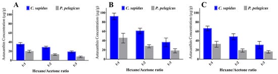 Astaxanthin yield recovered from C. sapidus and P. pelagicus exoskeleton using various hexane/acetone ratios. Exoskeleton without pretreatment (A), exoskeleton pretreated with B. amyloliquefaciens CPFD8 before solvent extraction (B), and exoskeleton pretreated with S. cerevisiae 006-001 before solvent extraction (C).