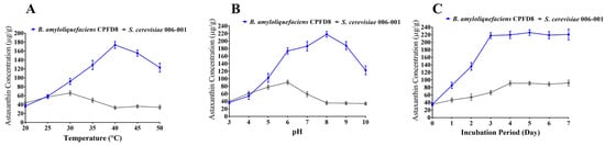 In this study, the impact of temperature, pH, and incubation period on the astaxanthin yield was investigated. Results revealed that the optimum temperature for maximum recovery of astaxanthin was 30 and 40 °C for S. cerevisiae 006-001 and B. amyloliquefaciens CPFD8, respectively (Figure 3A). The optimum pH value was observed at 8.0 and 6.0 for B. amyloliquefaciens CPFD8 and S. cerevisiae 006-001, respectively (Figure 3B). The effect of the incubation period was investigated by the cultivation of B. amyloliquefaciens CPFD8 and S. cerevisiae 006-001 on the C. sapidus exoskeleton waste for various incubation periods prior to the extraction process. The maximum astaxanthin recovery was attained after 3 and 4 days of incubation with B. amyloliquefaciens CPFD8 and S. cerevisiae 006-001, respectively (Figure 3C). Under the optimum conditions, the astaxanthin yield was 217.96 and 91.23 µg/g when C. sapidus exoskeleton waste was exposed to B. amyloliquefaciens CPFD8 and S. cerevisiae 006-001, respectively.