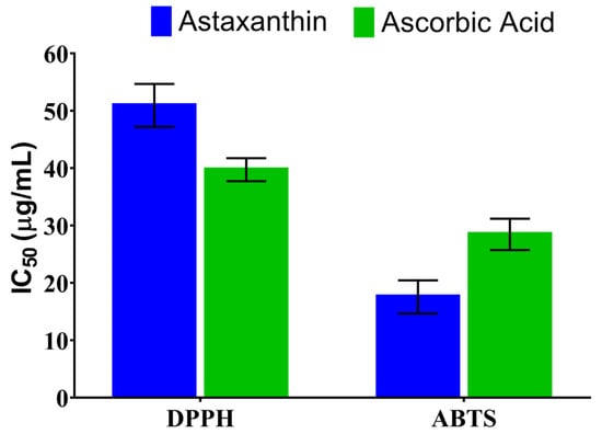 Results revealed the remarkable antioxidant potential of astaxanthin extracted from C. sapidus with efficient DPPH and ABTS radical scavenging activity. Clearly, the IC50 value of astaxanthin and ascorbic acid against DPPH was 50.93 and 39.73 µg/mL, respectively. In addition, the extracted astaxanthin showed superior ABTS radical scavenging activity compared with ascorbic acid. The IC50 value of astaxanthin and ascorbic acid against ABTS was 17.56 and 28.46 µg/mL, respectively (Figure 4).