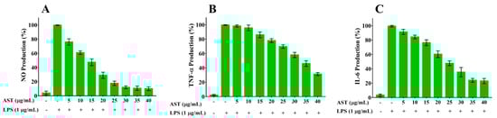 Clearly, treatment of the murine macrophage RAW264.7 cells with LPS resulted in a marked increase in NO, TNF-α, and IL-6 production. However, co-treatment of cells with astaxanthin induced significant attenuation of LPS-induced production of NO, TNF-α, and IL-6 production in a dose-dependent manner (Figure 5). The production of NO was reduced by 88% in LPS-induced cells treated with 30 µg/mL of astaxanthin. Results showed no significant difference in TNF-α production by LPS-induced cells treated with astaxanthin up to 15 µg/mL. Further increase in astaxanthin concentration resulted in significant reduction in TNF-α production compared with cells treated with LPS only. More than 68% reduction was recorded in LPS-induced cells treated with 40 µg/mL astaxanthin. Regarding IL-6, about 76% reduction was observed in LPS-induced cells treated with 35 µg/mL astaxanthin.
