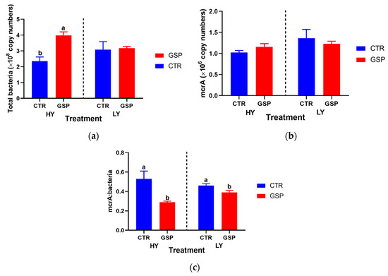 The 30 mg GSP addition increased the abundance of total bacteria by 1.7 times relative to the control in the HY group, but no difference occurred in the LY group (Figure 3). The 30 mg GSP addition did alter the total methanogen abundance, as revealed by the mcrA gene in both LY and HY groups (p > 0.05). However, the 30 mg GSP addition significantly decreased the abundance ratio of methanogens to total bacteria (B:M), and the decrease was more pronounced in HY than LY (45.3% vs. 15.2% decrease).