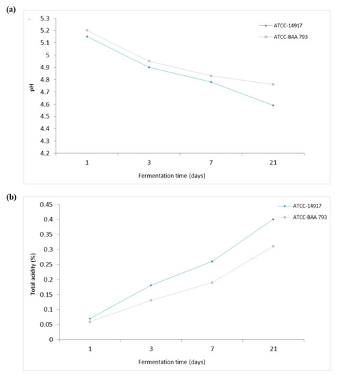 pH (a) and total acidity (b) changes of fermented olive leaf with L. plantarum ATCC 14917 and BAA-793 culture at 30 °C for 21 days.