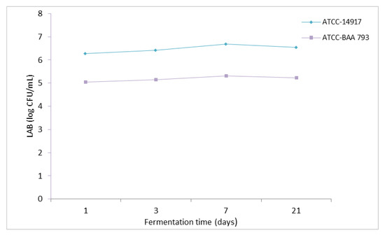 Lactic acid bacteria (LAB) count in olive leaves inoculated with L. plantarum ATCC 14917 and L. plantarum ATCC-BAA 793.