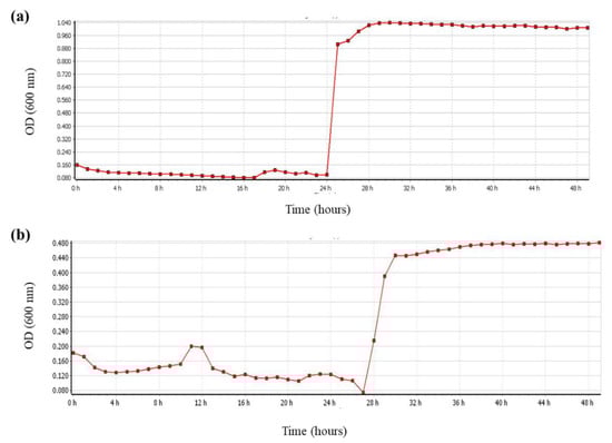 Some studies have demonstrated the ability of L. plantarum strains to tolerate high (>8%) NaCl concentrations [25,26,27]. In the present study, the effect of ambient conditions on bacterial growth was determined according to the growth curves of L. plantarum ATCC 14917 and L. plantarum ATCC-BAA 793 using a microplate reader. Stress conditions, such as concentration of salt (5%) and incubation temperature (30 °C), did not show a negative effect on the growth and particularly the oleuropein biodegradation capacity of L. plantarum ATCC 14917 and L. plantarum ATCC-BAA 793 (Figure 3). In another study in which the fermentation process of olives was controlled by two bacterial species (L. plantarum S175 and L. pentosus), the interaction between cell concentration and time significantly affected the development of the LAB population. This LAB population showed a slight increase from 5.7−9 × 107 cfu/mL to about 109 cfu/mL during the first 15 days of the fermentation, then decreased to about 2 × 105 cfu/mL at the end of the fermentation [18].