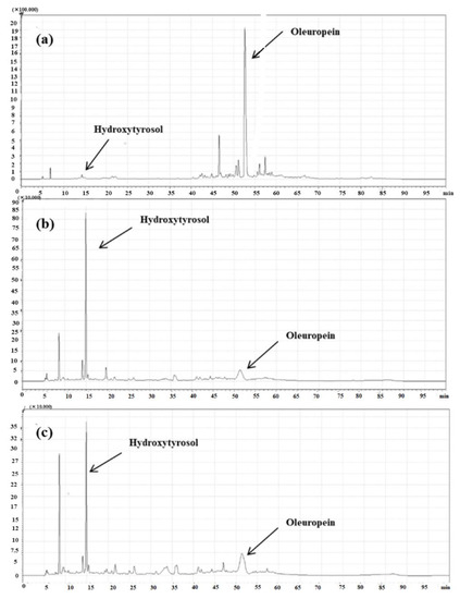 LC-DAD-ESI-MS/MS chromatograms obtained for the hydroxytyrosol content of samples at the optimum point, (a) fermented leaves and brine with L. plantarum ATCC 14917; (b) fermented leaves and brine with L. plantarum ATCC-BAA 793; (c) control (non-inoculated).