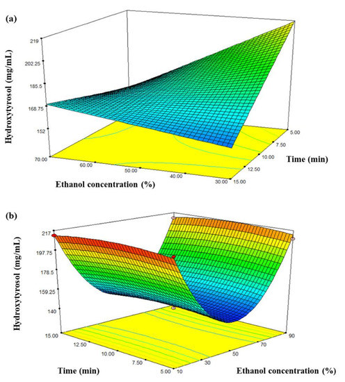 Moreover, to visualize the effects of independent variables on hydroxytyrosol content, the response surface plot was obtained (Figure 5). As shown in Figure 5a, the hydroxytyrosol concentration increased as the ethanol concentration and extraction time decreased in L. plantarum ATCC 14917 fermented olive leaf brine. On the contrary, the hydroxytyrosol concentration of the sample fermented with L. plantarum ATCC-BAA 793 increased as the ethanol concentration decreased and the extraction time increased (Figure 5b).