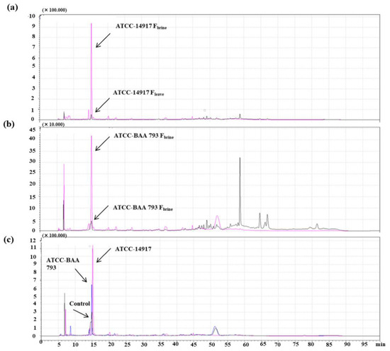 Bioconversion of oleuropein to hydroxytyrosol in control samples (non-inoculated) (a) and the fermented olive leaf brine inoculated with L. plantarum ATCC 14917 (b) and L. plantarum ATCC-BAA 793 (c).