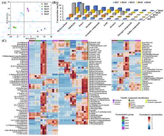 Change in volatile compounds of Yulu during fermentation with B. subtilis. (A) Similarity analysis of volatile compounds among different fermentation groups via PCA. (B) Change in total concentration of volatile compounds in each classification in different fermentation groups. (C) Heatmap of volatile compounds in each classification in different fermentation groups.