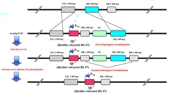 The gene editing approach taken to perform marker-free knock-in gene replacement (Figure 2) was described in detail in our previous work [,]. B. subtilis containing the mutant alpha subunit of the phenylalanyl-tRNA synthetase gene (pheS*) will not survive in the presence of 4-chloro-DL-phenylalanine. The mutant gene (pheS*) was inserted within a counter-selectable cassette (containing a chloramphenicol resistance gene (cat) and pheS* gene, and this cassette is referred to as PC). The strains and plasmids are listed in Table 1 and primers listed in Table 2 were used to amplify the following gene fragments: left flanking of sfp− gene (LJ-3, LF) (~1000 bp), Pveg strong promoter (B. subtilis 168, Pveg-GFP), insertion gene (B. velezensis BS-37, sfp+), direct repeat (LJ-3, DR) (~400 bp) sequence, counter-selectable cassette (PC), and right flanking of LF (LJ-3,RF) (~800 bp). These fragments were then fused by overlapping PCR in the order LF-Pveg-sfp+-DR-PC-RF. The PCR products were introduced into the LJ-3 and transformants were selected on chloramphenicol and MGY-Cl containing agar plates. The positive transformants were named LJ-31.