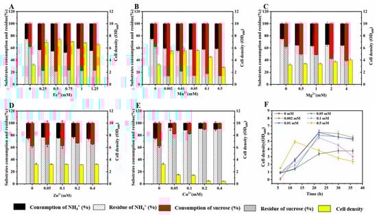 Cell density and the yield of functional products usually show a positive linear correlation, and therefore, high cell density results in a high yield of functional products []. However, production strains that use inorganic nitrogen usually exhibit lower cell density []. Trace metal elements are essential for bacterial growth. Metal ions were also essential for bacteria to promote the uptake of NH4+ or NO3− [,,]. To further promote LJ-3 cell growth, the effects of five metal ions (Fe2+, Mn2+, Mg2+, Cu2+, and Zn2+) on cell growth and the utilization of different substrates were examined (Figure 4).