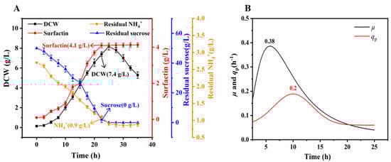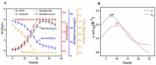 The fermentation process and related kinetic parameters (µ, qp) in an optimized fermentation system. (A) Changes in substrate, DCW, and surfactin yield. (B) The specific yield of surfactin (qp) and specific growth rate (µ).