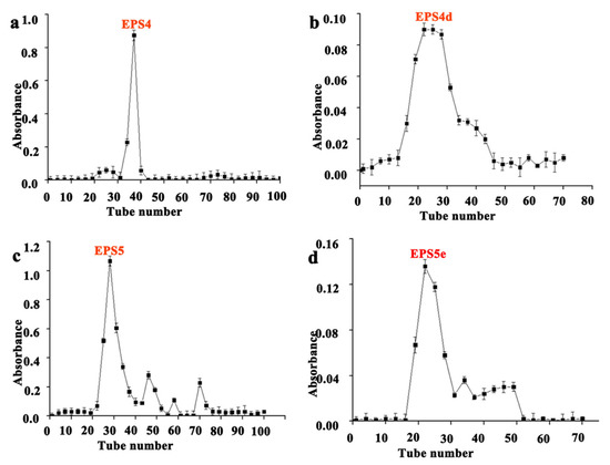 According to the elution peak position in Figure 2d, the eluent of tubes 20–30, named EPS5e, was combined and freeze-dried in a vacuum to obtain a white polysaccharide sample, proving that the pigment had been removed.