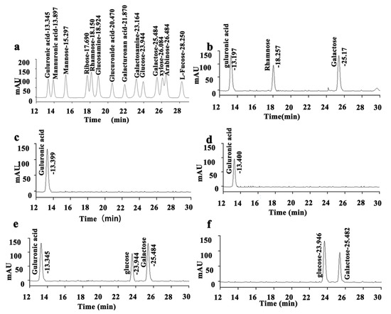 Determination of monosaccharide composition of EPS. (a) HPLC of mixed standard monosaccharide derivatives, (b) EPS1a derivatives, (c) EPS2b derivatives, (d) EPS3c derivatives, (e) EPS4d derivatives, and (f) EPS5e derivatives.