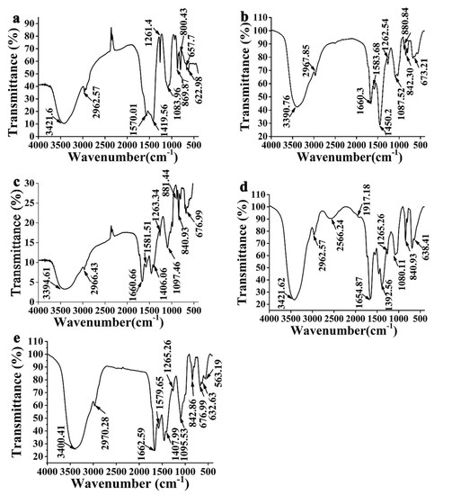 Figure 4a indicates that EPS1a has a broad and strong absorption which appears at 3421.6 cm−1, which is the performance of the O-H bond stretching vibration between sugar molecules or within molecules [41]. The characteristic absorption peak induced by the stretching vibration of the C-H bond is observable at 2962.57 cm−1 [42]. The peak around 1200~950 cm−1 is considered the fingerprint area of EPS. 1570.01 cm−1 is the carboxyl asymmetric stretching vibration peak, and the peak at 1419.56 cm−1 is the C-H bond variable angle vibration peak [41,43,44]. The two peaks of 1261.4 and 1083.96 cm−1 are induced by two C-O stretching vibrations. The former is the C-O-C of the pyranose ether bond, while the latter is the hydroxyl absorption peak [45,46]. The absorption peak at 869.87 cm−1 suggests that the end group carbon is the result of the joint action of α- and β-. Figure 4b illustrates that EPS2b has a wide and significant absorption peak centered at 3390.76 cm−1, which is the performance of the stretching vibration of the O-H bond [41]. The characteristic absorption peak induced by the stretching vibration of the C-H bond is observable at 2967.85 cm−1 [42]. At 1660.3 cm−1, it is the asymmetric stretching vibration peak of the carboxyl group [29]. At 1450.2 cm−1, there is C-H bond angular vibration [41,43,44]. The peaks at 1262.54 and 1087.52 cm−1 are caused by two kinds of C-O stretching vibration, which are the C-O-C of pyranose internal ether bond and the hydroxyl absorption peak [45,46]. The peaks of 880.84 and 842.30 cm−1 terminal carbon are the result of the joint action of α- and β-. Figure 4c shows that EPS3c has a broad and strong absorption peak at 3394.61 cm−1, which is the performance of the stretching vibration of the O-H [41]. There is absorption which appears at 2966.43 cm−1, which is the characteristic absorption caused by the stretching vibration of the C-H bond [42]. At 1660.66 cm−1, it is the asymmetric stretching vibration peak of the carboxyl group [29], and at 1406.06 cm−1, it is the variable angle vibration of the C-H bond [41,43,44]. The peaks at 1263.34 and 1097.46 cm−1 are induced by two kinds of C-O stretching vibration. One is the C-O-C of the pyranose inner ether bond, and the other is the hydroxyl absorption peak [45,46]. The peaks at 881.44, 840.93, and 676.99 cm−1 prove that the end group carbon is the result of the joint action of α- and β-. Figure 4d demonstrates that EPS4d has a wide and significant absorption peak centered at 3421.62 cm−1, which is the performance of the stretching vibration of the O-H bond [41]. There is an absorption peak at 2962.57 cm−1, which is the characteristic absorption peak caused by the C-H bond stretching vibration [42]. The asymmetric stretching vibration peak of the carboxyl group is at 1654.87 cm−1 [29], and the variable angle vibration of the C-H bond is at 1392.56 cm−1 [41,43,44]. The peaks at 1265.26 and 1080.11 cm−1 are induced by two C-O stretching vibrations. One is the C-O-C of the pyranose inner ether bond, and the other is the hydroxyl absorption peak [45,46]. The peak at 840.93 cm−1 proves that the terminal carbon is the result of α-type action, and 638.41 cm−1 is the characteristic absorption peak of glucose residues. Figure 4e shows that EPS5e has a wide and significant absorption peak at 3400.41 cm−1, which is the performance of the O-H bond stretching vibration [41]. The absorption peak centered at 2970.28 cm−1 is the characteristic absorption caused by the stretching vibration of the C-H bond [42], 1662.59 cm−1 is the asymmetric stretching vibration of the carboxyl group [29], and 1407.99 cm−1 is the variable angle vibration of the C-H bond [41,43,44]. The two peaks at 1265.26 and 1095.53 cm−1 are caused by two kinds of C-O stretching vibration. One is the C-O-C of the pyranose inner ether bond, and the other is the hydroxyl absorption peak [45,46]. The peak at 842.86 cm−1 shows that the end group carbon is the result of α-type action, and the peak centered at 632.63 cm−1 is the characteristic absorption of glucose residues.