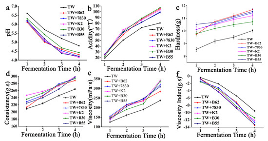 The effect of five strains of EPS-producing LAB on the quality of goat milk fermentation. (a) pH, (b) acidity, (c) hardness, (d) consistency, (e) viscosity, and (f) viscosity index.