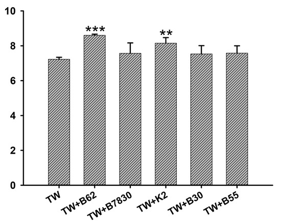 Only the TW starter was added as the control. During the fermentation period of 1, 2, 3, and 4 h, the fermented goat milk samples were taken to measure pH, acidity, texture, and other indicators. TW is the control commercial starter, which is composed of Lactobacillus bulgaricus and Streptococcus thermophilus. The pH of the fermented goat milk decreased with time, while the acidity increased over time. The pH value of the fermented goat milk with five added EPS-producing strains decreased rapidly, and the pH values at the end of fermentation were 4.8 for the TW starter, 4.3 for the TW starter +B62, 4.21 for the TW starter +7830, 4.15 for the TW starter +K2, 4.42 for the TW starter +B30, and 4.21 for the TW starter +B55 (Figure 5a). The acidity of the fermented goat milk with five added strains of EPS-producing LAB also increased faster than that with only TW starter added. At the end of fermentation, the acidity values at 4 h were 80.44 °T for the TW starter, 105.33 °T for the TW starter +B62, 99.84 °T for the TW starter +7830, 103.33 °T for the TW starter +K2, 107.03 °T for the TW starter +B30, and 98.62 °T for the TW starter +B55 (Figure 5b). With the extension of time, the hardness and consistency of the fermented goat milk increased. During the fermentation process of LAB, lactose in the goat milk is decomposed into lactic acid, which makes the protein in the milk denature and coagulate to form a fermented yoghurt with viscosity. The hardness and consistency of fermented goat milk with added EPS-producing LAB are higher than those of the pure starter, and the hardness values at the end of fermentation were 10.03 g for the TW starter, 11.68 g for the TW starter +B62, 11.43 g for the TW starter +7830, 11.20 g for the TW starter +K2, 10.72 g for the TW starter +B30, and 11.53 g for the TW starter +B55, respectively. The consistency values at the fermentation endpoint of 4 h were 263.78 g·s for the TW starter, 287.91 g·s for the TW starter +B62, 293.66 g·s for the TW starter +7830, 298.51 g·s for the TW starter +K2, 293.51 g·s for the TW starter +B30, and 297.83g·s for the TW starter +B55 (Figure 5c,d). The interaction between the EPS and milk protein affected the texture properties of the fermented milk, especially the viscosity of the sour milk. During the fermentation process, the viscosity of the fermented goat milk increased with the extension of fermentation time and reached the maximum value at 4 h (Figure 5e,f). The variation trend of each strain was basically the same. The viscosity and viscosity index of the fermented goat milk of the five added strains of EPS-producing LAB were higher. The viscosity values at the fermentation endpoint of 4 h were: TW starter culture, 237.53 mPa·s; TW starter culture +B62, 284.92 mPa·s; TW starter culture +7830, 319.59 mPa·s; TW starter culture +K2, 341.13 mPa·s; TW starter culture +B30, 337.57 mPa·s; and TW starter culture +B55, 309.24 mPa·s. The viscosity indexes at the fermentation endpoint of 4 h were: TW starter culture, −9.56 g·s; TW starter culture +B62, −13.51 g·s; TW starter culture +7830, −12.67 g·s; TW starter culture +K2, −12.12 g·s; TW starter culture +B30, −11.44 g·s; and TW starter culture +B55, −13.30 g·s (Figure 5e,f). The results of sensory evaluation showed that the textures of the fermented goat milk were improved by adding five strains of EPS-producing LAB. TW + B62 had an extremely significant value (p < 0.001) and TW + K2 had a highly significant value (p < 0.01) compared with the control group (Figure 6).