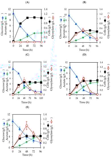- Deng, Y.; Mao, Y.; Zhang, X. Metabolic engineering of E. coli for efficient production of glycolic acid from glucose. Biochem. Eng. J. 2015, 103, 256–262. [Google Scholar] [CrossRef]