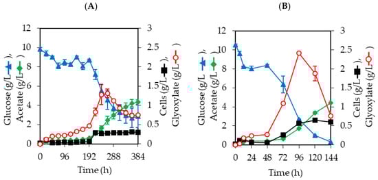 - Renilla, S.; Bernal, V.; Fuhrer, T.; Castaño-Cerezo, S.; Pastor, J.M.; Iborra, J.L.; Sauer, U.; Cánovas, M. Acetate scavenging activity in Escherichia coli: Interplay of acetyl-CoA synthetase and the PEP-glyoxylate cycle in chemostat cultures. Appl. Microbiol. Biotechnol. 2012, 93, 2109–2124. [Google Scholar] [CrossRef]