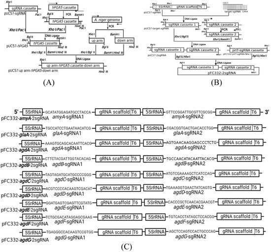 - Shen, Y.; Chen, Z.; Chen, J.; Zhao, B.; Lu, J.; Gui, L.; Lu, F.; Li, M. An efficient marker-free genome editing method for Aspergillus niger. Sheng Wu Gong Cheng Xue Bao Chin. J. Biotechnol. 2022, 38, 4744–4755. [Google Scholar] [CrossRef]