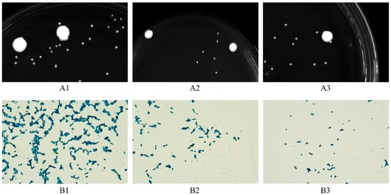 Morphological characterization of strains. (A) The colony morphology of the strains (A1–A3) in order is shown for strains Y2, Y5, and Y7. (B) Cell morphology of strains under light microscope (×100) after staining with lactophenol cotton-blue stain. (B1–B3) The cell morphology of strains Y2, Y5, and Y7 in order.
