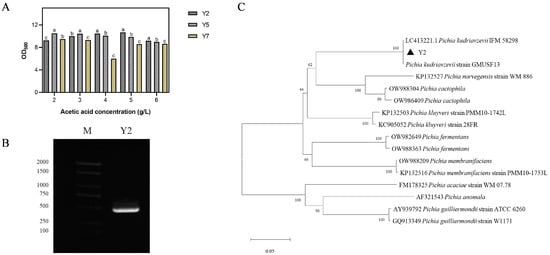 Screening and molecular identification of acid-tolerant yeast strains. (A) The growth of strains Y2, Y5, and Y7 under different concentrations of acetic acid stress (OD600), respectively, with different lowercase letters indicating significance. (B) Electrophoresis bands at 1% (w/v) agarose gel of the PCR amplification product of strain Y2, lane M (Maker). (C) Phylogenetic tree constructed based on strain Y2.