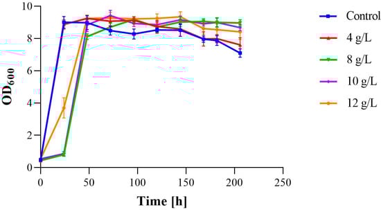 Biomass of Pichia kudriavzevii Y2 during fermentation (control) and its growth under different concentrations of acetic acid stress (4 g/L, 8 g/L, 10 g/L, and 12 g/L).