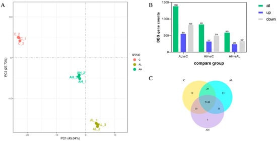 Transcriptome analysis of Pichia kudriavzevii Y2. C: control group, AL: low-concentration acetic acid group (4 g/L), AH: high-concentration acetic acid group (8 g/L). (A) Principal component analysis results. The abscissa is the first principal component, and the ordinate is the second principal component. (B) Statistical histogram of the number of differentially compared genes in combination. Blue and grey represent upregulated and downregulated differential genes, respectively, and the numbers on the bars represent the number of differential genes. (C) Venn diagram of coexpression.