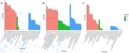 GO (gene ontology) enrichment analysis. The horizontal coordinate is the GO term, the vertical coordinate is the significance level of GO term enrichment, expressed by -log10 (padj), and different colors indicate different functional classifications, respectively. C: control group, AL: low-concentration acetic acid group (4 g/L), AH: high-concentration acetic acid group (8 g/L). (A) AL vs. C; (B) AH vs. C; (C) AH vs. AL.