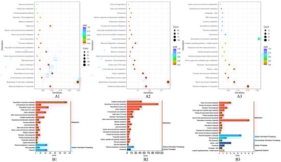 KEGG (Kyoto Encyclopedia of Genes and Genomes) pathway enrichment analysis. C: control group, AL: low-concentration acetic acid group (4 g/L), AH: high-concentration acetic acid group (8 g/L). (A) KEGG enrichment scatter plot (A1–A3) in the order of AL vs. C, AH vs. C, and AH vs. AL. The horizontal coordinate is the ratio of the number of differential genes annotated to the total number of differential genes on the KEGG pathway, and the vertical coordinate is the ratio of the KEGG pathway. (B) KEGG pathway classification chart (B1–B3) in the order of AL vs. C, AH vs. C, and AH vs. AL. The horizontal coordinate is the number of differential genes annotated to the KEGG pathway, and the vertical coordinate is the KEGG pathway and its functional classification.