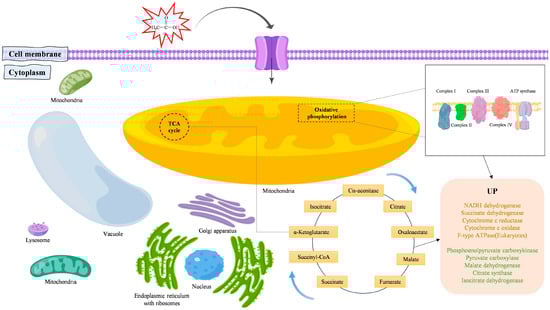 In most cells, mitochondrial oxidative phosphorylation is central to metabolism and is the main source of ATP (>95%), accounting for more than 95% of the total oxygen consumption. Any perturbation of the oxidative phosphorylation function has a direct impact on cellular metabolism [28]. An enhanced oxidative phosphorylation and an increased respiratory capacity were reported in Streptomyces albulus under low-pH stress. Among them, genes related to succinate-Q reductase and cytochrome C oxidase were significantly upregulated, while the δ-subunit (atpH), β-subunit (atpF), and C subunit (atpE) of ATP synthase were downregulated, which may be aimed at limiting H+ influx into the cell under acidic conditions, thus preventing the acidification of the intracellular environment [29]. Under acetic acid stress, the permeability of Saccharomyces cerevisiae’s membrane increases, and V-ATPase acts as a proton pump to pump H+ out of the cell and into subcellular vesicles to restore homeostasis in vivo. However, this process requires a large consumption of ATP [30]. For Saccharomyces cerevisiae, ATP is mainly produced by glycolysis, the TCA cycle, and oxidative phosphorylation [31]. In addition, during brewing, major genes in the NADH/NADPH regeneration reaction are upregulated when under a variety of stress conditions, thus enabling a normal biosynthetic pathway for amino acids, lipids, and nucleotides in Saccharomyces cerevisiae [32]. In our study, DEGs were significantly enriched in the oxidative phosphorylation pathway under acetic acid stress, and the enrichment was more pronounced at higher acetic acid concentrations. In addition, four protein complexes (NADH dehydrogenase, succinate dehydrogenase, cytochrome C reductase, and cytochrome C oxidase) and F-type H+-transporting ATPases (alpha (1.54-/1.08-fold), delta (1.74-/1.29-fold), and OSCP (1.80-/1.24-fold)) in the respiratory chain of the acid-tolerant yeast Y2 were significantly upregulated. The upregulation was greater in the higher-acetic-acid-concentration group. These results suggested that under acetic acid stress, the acid-tolerant yeast Y2 had an enhanced oxidative phosphorylation ability, an increased respiratory capacity, and an increased translocation of H+, which maintained homeostasis inside and outside the cell, which may be the mechanism of action by which the strain Y2 tolerated the low pH.