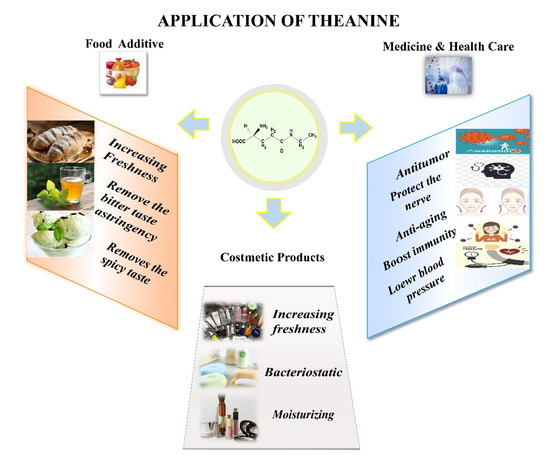 In medicinal health, theanine has a wide range of biological activities, mainly in its synergistic ability to protect nerves, relieve stress, lower blood pressure, improve immunity, anti-aging, anti-inflammatory and anti-tumor. Williams et al. reported that L-theanine as an oral nutrient at 200–400 mg can have a significant effect on reducing stress and anxiety [2]. L-theanine may prevent bladder dysfunction by inhibiting chronic sympathetic hyperactivity [3]. As a unique bioactive regulator, theanine can inhibit tumor growth and metastasis by mediating cell apoptosis [4,5]. In the cosmetics industry, theanine has anti-aging and moisturizing functions. In recent years, in vitro functional and safety evaluation studies have been conducted on a series of products to clarify the efficacy and mechanism of theanine as an active ingredient in cleansing, antibacterial, and skincare products. A wide range of skincare and make-up products containing theanine are on the market, at present [6]. In addition, because of the numerous benefits that theanine provides to human health, it has been researched and applied as a food additive in foods for a long time [7]. Since 1964, theanine has been considered as one of the common functional food additives in Japan, allowing the addition of theanine to foods other than infant foods. Based on the good safety and stability of theanine, it can be used as a food flavor regulator to reduce bitterness and improve the freshness of tea soup [8]. Theanine is most widely used in food products, such as tea drinks, baked snacks, and frozen sweets [9].