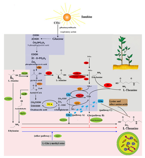 Synthetic pathways of theanine in tea plants and microorganisms. The light−gray background image represents the L−theanine production pathway in tea tree; the light−pink background image represents the microbial L−theanine production pathway; the purple section shows the co−synthetic pathway. Glu: glutamate; Gln: glutamine; main enzymes involved in the metabolic pathway; PK: pyruvate kinase; PDC: pyruvate decarboxylase; ALT: alanine aminotransferase; AIDA: alanine decarboxylase. SAMDC: S−methionine decarboxylase; ADC: arginine decarboxylase; NR: nitrate reductase; NiR: nitrite reductase; TS: theanine synthase; GOGAT: glutaminase−α−ketoglutarate aminotransferase; GDH: glutamate dehydrogenase; BsAld: alanine dehydrogenase; CsAlaDC: alanine decarboxylase; eutE: acetaldehyde dehydrogenase; pPTA: aminotransferase; GGT: gamma−glutamyl transpeptidase; GA: glutaminase; GMAS: gamma−glutamine methyl amide synthase; GS: glutamine synthetase; GCS: gamma−glutamyl cysteine synthase; L−Glu−γ−methyl ester: L−glutamyl−γ−methyl ester.