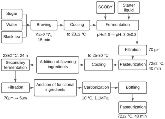 - Vorobyeva, V.M.; Vorobyeva, I.S.; Sarkisyan, V.A.; Frolova, Y.V.; Kochetkova, A.A. Technological features of fermented beverages production using kombucha. Vopr. Pitan. 2022, 91, 115–120. [Google Scholar] [CrossRef]