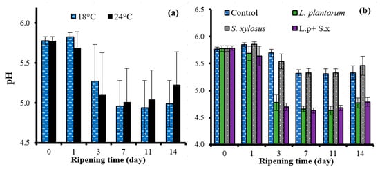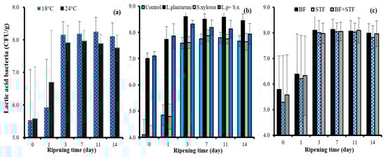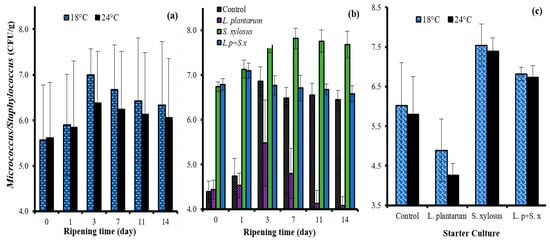 The most important stage for the development of micrococci and staphylococci comprises the first days of ripening. The growth of these acid-sensitive bacteria is significantly affected by rapid acidification. Therefore, the lowest mean value was determined in fast-ripening (24 °C) sucuk in the study (Table 1). In previous studies on sucuk, it was also determined that coagulase-negative staphylococci were significantly affected by acidification [,,,].