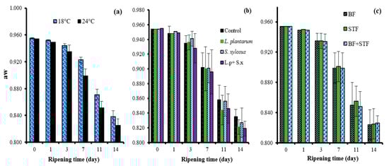 It has been determined in other studies on sucuk that aw decreases faster in sucuk produced using lactic starter culture than in sucuk naturally fermented [,,]. The aw value of the sucuk decreased as the time progressed (Table 1). However, this decrease was quicker in fast ripening (Figure 4a). Lactic acid bacteria are effective in fermented sausages due to their acid formation and therefore also have an impact on drying. In the present study, lower aw values were generally detected in the final product in the presence of L. plantarum GM77 (Figure 4b). The use of only sheep tail fat also caused some differences in the aw value during ripening (Table 1, Figure 4c).