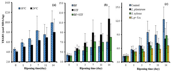 As the ripening time progressed, the TBARS value increased (Table 1). Another important result of the TBARS values of samples was that the L. plantarum + S. xylosus culture yielded lower values from the third day of ripening compared to the other groups (control, L. plantarum, S. xylosus) (Figure 5c). It was also determined that the TBARS value increased as the ripening time progressed in other studies [,,].