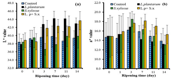 The L* value, a measure of brightness, was higher in the L. plantarum GM77 groups than in the control and S. xylosus GM92 groups. The mean L* value increased as the ripening period progressed, but there was no statistical difference between the values from the seventh day (Table 2). Starter cultures exhibited different effects during ripening. L. plantarum GM77 and L. plantarum GM77+ S. xylosus GM92 caused a significant increase in L* on day 3 of ripening. Similarly, it has been reported that lactic acid bacteria also increase the L* value in dry cured meat products []. In this study, there was generally no significant change during ripening in the control group. In the S. xylosus GM92 group, the L* value remained below 40 during ripening. According to these results, S. xylosus GM92 alone did not cause a significant increase in the L* value, an indicator of lightness-darkness (Figure 6a).